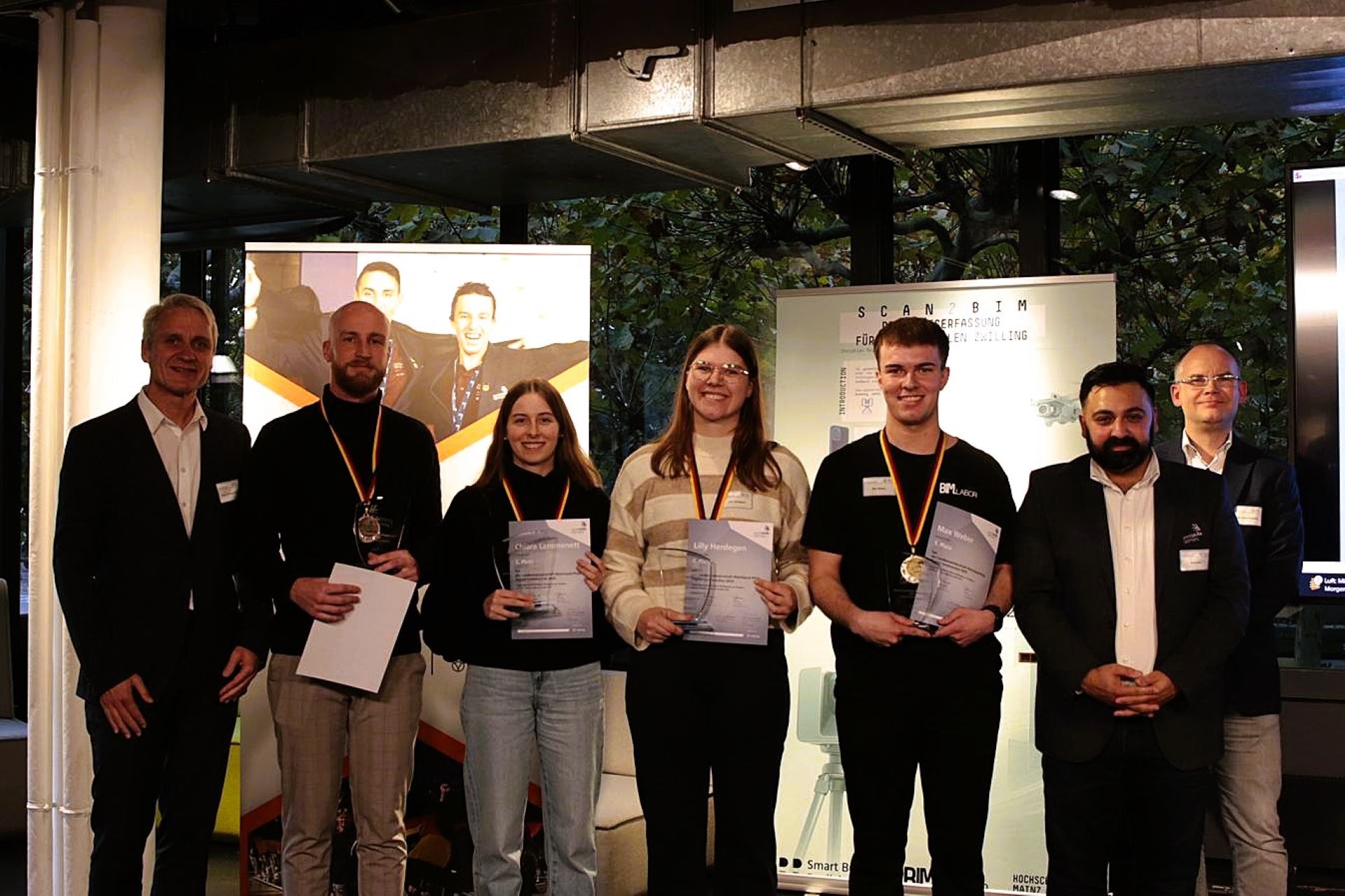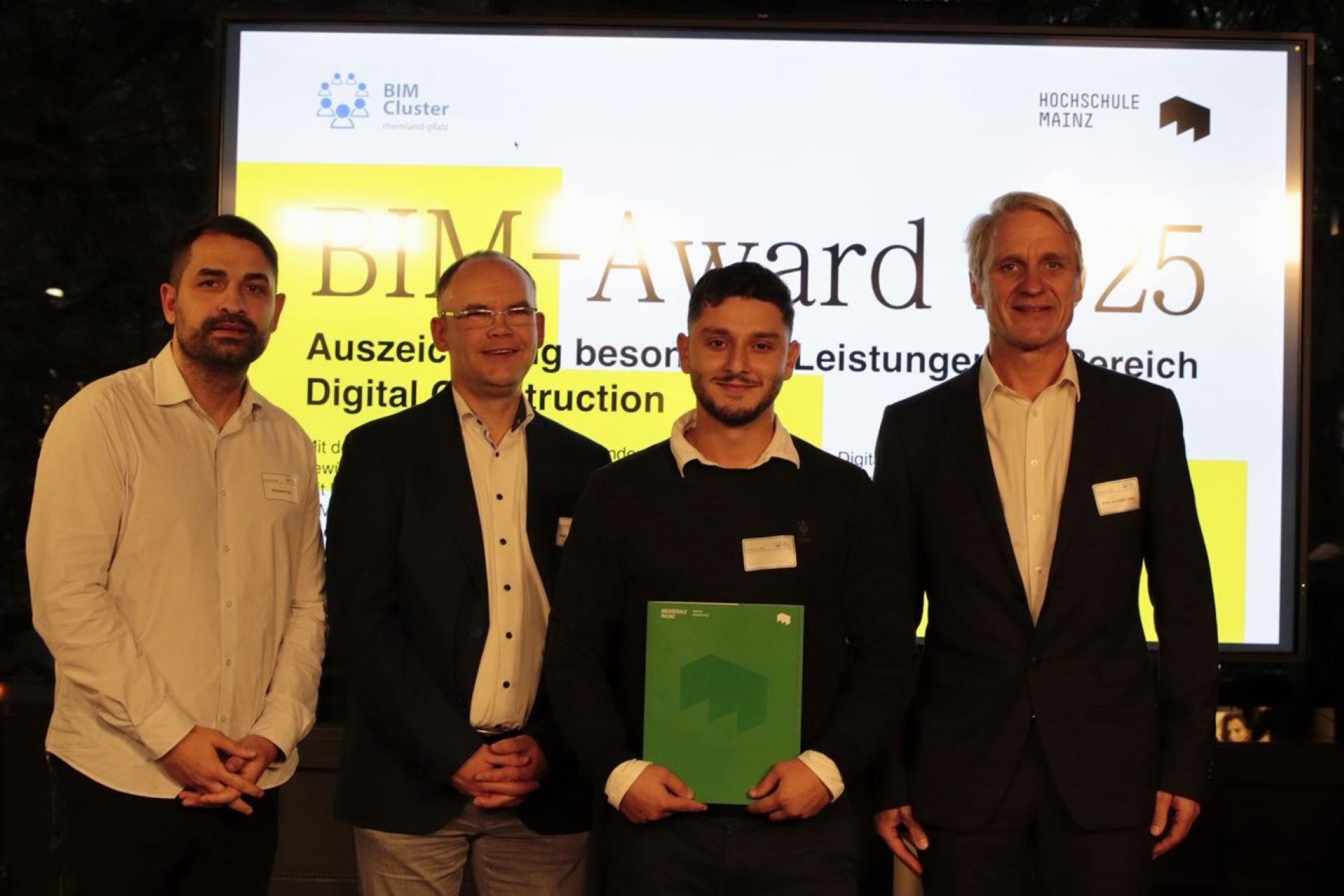 Zum anderen wurde beim diesjährigen BIM-Symposium der erste BIM-Award des BIM-Clusters Rheinland-Pfalz verliehen. Der vom Ministerium der Finanzen geförderte Preis zeichnete drei besondere wissenschaftliche Leistungen im Bereich digitales Planen und Bauen an der Hochschule Mainz aus.
